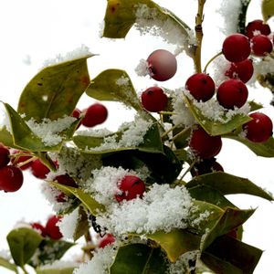 クリスマスホーリー🎄🔴 今朝の庭❄️ うっすらまっ白🤍 クリスマス気分🎄🎶 ③イロハモミジ ④ブルーアイス ⑤トウヒ🍃