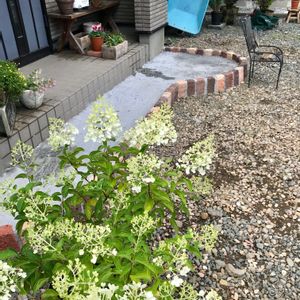 暑い💦 蒸し暑い💦 庭仕事終えて 定番のアサヒドライゼロ🍺 旦那様DIYの玄関ステップが あとわずかで完成予定だとか。 レンガの高さに合わせてタイルを クラッシュしてモルタルで貼るのだそうだ。 図面の作成から始まり不機嫌に なりながらも頑張っております! 円形になってるスペースは お気に入りの鉢植えを置けるよう にとのお気持ちだそうです笑笑 ピラミッドアジサイ ノリウツギが大きく開いてきました。