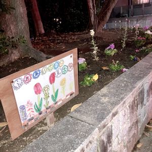 夜明け前ウォーキング途中🚶 小学校の校庭外花壇 『ふれあい花だん みてね』と小学生手書きの看板がありました 小さなお花🌸🌼も小学生が植え 手入れしているのでしょう 斜めになってるものもあります😊 ほっこり しました😃