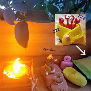 キャンプファイヤーをする二人。 マシュマロを焼いているんです。 カニくんは2つ居候くんは1つ🤭 …あの話?