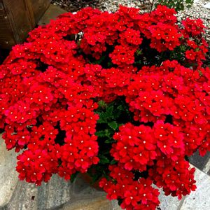 おはようございます*ˊᵕˋ* 昨日もムシムシとした天気で暑かったです。今日も暑くなるのかな? 今日のpicは、先日載せたバーベナ‘花手毬~絢~’。 2階リビングの窓の所にある花台を外から撮影したものです✩(*˘︶˘*).:* 花台は、家を建てた時にネットで探して、足場があるうちに工事の人に付けてもらいました。 今年の春、外装工事の際、窓枠の色を白からブルーグレーに変えたので、ヨーロッパによくある風景のように赤い花を置きたいと思って、最初はゼラニウムを考えたんですが、ここは、西日がガンガン当たる場所…。ゼラニウムは日は好むけど夏の西日は避けて下さいと書いてある… そこで、西日にも強い赤い花を探しにHCへ… ちょうど4連パックのヨーグルトサイズのような4連パックの赤いバーベナを見つけて…これだ!と…。 2階なので、プランターから溢れるように見えるまで時間はかかりましたが、やっと良い感じになりました💕 ちなみに真ん中のプランターは、赤も混じるマリーゴールド ストロベリーブロンドにしたんですが… 今のところ黄色いですね…😅 来年は、全部赤いバーベナにしようかな? *7月17日に家の中から撮影した写真があります。合わせて見て貰えたら幸いです😃