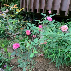 今朝の庭から➰ 🥀スブニール ドゥ ヴィクトル ユーゴ 又また 🌸開き始めました(*゚▽゚*)♪♡ 蕾も含めると🌸13個🎶 枝から伸びた左のシュート🌿 このままで良いのかなぁ❓ アドバイス頂けると嬉しいです🥰