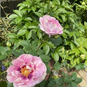 おはようございます☔️ 今朝のお花は 庭のバラ🌹 1 しのぶれど ゆっくり開花です💜🩷 雨と風に耐えています 2 ピエールドゥロンサール やっと1輪咲きました✨ クレマチスの蕾と並んで😊 3 アイズフォーユー それらしい色合いになってきました まだ小さいのに大きなお花が重たそうです😊