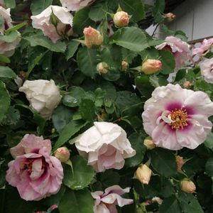 こんにちは🌥 いつもありがとうございます😊 我が家の庭にも バラが咲き始めました🥀 アイズフォーユー 中輪の房咲き 淡い赤紫色から白色へ変化します 我が家にあるバラの中では 早く咲く方です。 去年の冬、 他のバラの影になっているところから 思い切って移植してみました🥀 この場所の方が日当たりがいいので、 去年より、花が大きいように感じます🤔