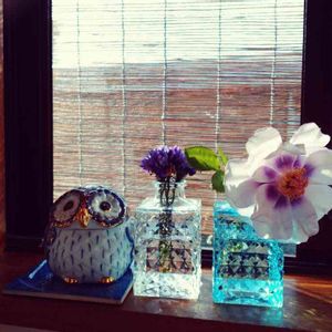西日の当たる窓辺 ダイソーの一輪挿しがまぶしい✨ スダレの影がメイプルソープのよう🎵 毎月3日は実生の日だけど、先月蒔いたメセンのドロサンテマムが発芽してから消えちゃって、今月は参加出来ないの