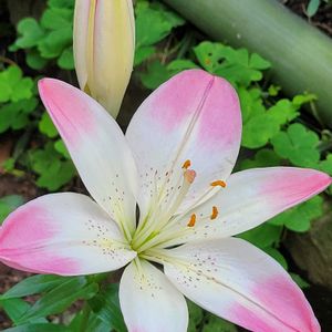 冷凍ユリの開花1号、シュガーラブ 8月末に10種類の球根を植えたうちの1種類です。 これは草丈60-120cmになるとの事だったのに20cm位しか伸びず、せっかくの蕾も半分は虫にやられてしまいました。 埋もれて咲いたので6月にまた咲くようにカットしました。 冷凍ゆりは球根を凍結する事により通常では咲かない時期に花が楽しむ事が出来る球根です。 花後、球根は埋めたままにするので、この後は通常の開花時期に咲きます。
