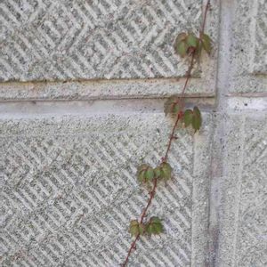 ふちが紅葉し始めているこれはおそらくナツヅタ ブロックの穴にしっかりと差し込まれた空き缶の経年具合が哀愁を感じます