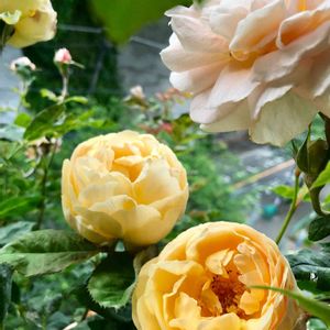 (*・ェ・*)ノ~☆コンバンワ♪ 咲きたがりのパットオースティン、3番花を沢山咲かせてます🧡 アブラハムダービーも3番花❣️ 夏顔でぱっかーんだけど色はアプリコットが濃く出ましたପ(⑅ˊᵕˋ⑅)ଓ ガブリエル様は2番花❣️ 咲かせるつもりなかったのに、摘芯し忘れてたみたいです💦 とにかくどんどん蕾が付くのでびっくりですΣฅ( °ロ° ฅ)