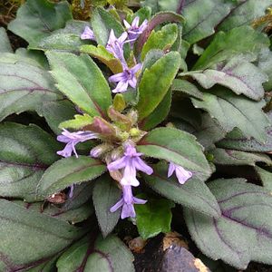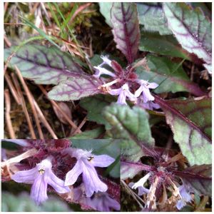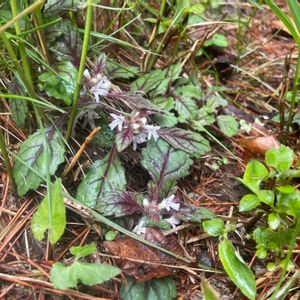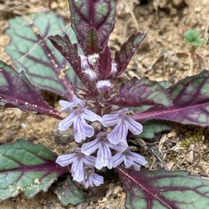 ツクバキンモンソウ しとしと降っていた雨も止んだので少し林に入ってみる♪ 母種ニシキゴロモと違って上唇が極端に短いようだが、当地は分布域ではなく実際には比べられない…。自分の目で比べられるのは我が家の庭のキランソウで、葉脈も葉の裏も紫色🟣 地獄の釜の蓋は裏返しにくいけれど緑です(^o^;)