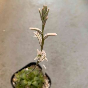 我が家のハオルチア報告 取り敢えずグングン伸びてはいるけれど まだ伸び足らないと ハオルチア自身は思ってる…🤨 白い透明な花🌼と分かってはいても じれったいものです😅