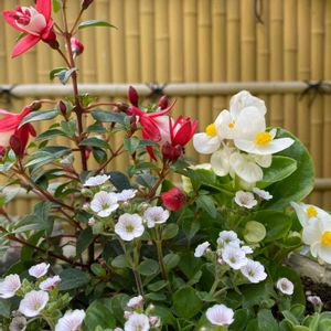 フクシア🌱主役に寄せ植えしたけれど、咲き始めたベゴニアとカーペットかすみ草の存在感がすごい…💓 お花に脇役はないなあ。。 朝一番に覗きたくなる☺️