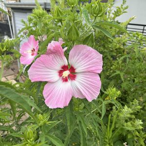 真紅のタイタンビカスに続いてピンクのタイタンビカス、イリスも咲き始めました。 一日花ですが、次々に咲くので夏中楽しめます。