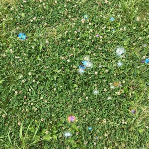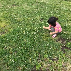 河原で。 娘が飛ばすシャボン玉とシロツメクサ。 あ!ウグイスが鳴いた! ホー、ホケキョ🎶 クローバー(シロツメクサ) マメ科 トリフォリウム属