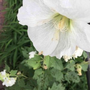 タチアオイ もうそろそろ花期も終わり頃。虫さんが食べはじめてて、花弁も薄く半透明になってました。 タチアオイ(ホリホック) アオイ科 タチアオイ属 あまり白いタチアオイは見かけないような。路上の街路樹スペースに咲いてました。