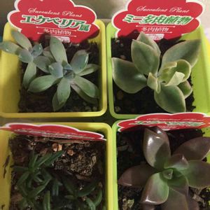 ダイソーから今日連れて来ました! 右下はブロンズ姫かなーと検索して思ったんですが、他がわかりません(;_;) 左下はクラッスラ属って書いてます! どなたか教えてください😣