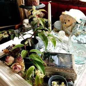 私の作ったローソクと 白い小さな花の 岩なんてんの花が 可愛い💕 手前の カップの花は カランコエの花 折れてたから 可哀想で 水に入れてみた☺️可愛いドライのバラ🌹と 好きな物置いた コーナー🎶🤗