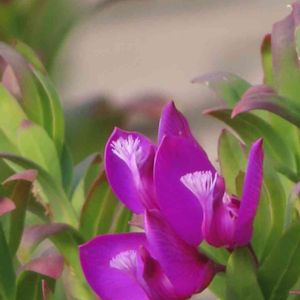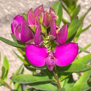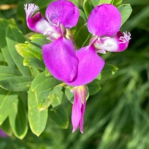 "おしゃれな土曜日" 散策路沿いの庭先。 ポリガラ・ミルティフォリアがスイートピーの様な可愛い赤紫色の花を付け、花弁の先端が白いひげのように変化してとってもお洒落でした。 ヒメハギ科ヒメハギ属の常緑低木。 撮影日 2023.1.10