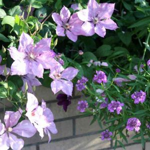 クレマチス マーガレットハントはアーチに誘引できなかったつるが下にたれさがって咲いています😃こぼれ種から咲いたキャンディタフトの色と合っています✨こんな偶然も見れてハッピー😃🎶