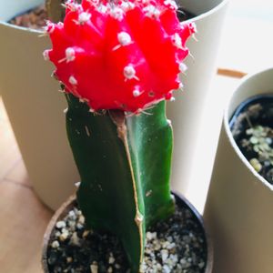 昨日ウエルシアで買った緋牡丹です❗️なんか鉢が派手だったので新しく買った植木鉢に植え替えました。(鉢の大きさは同じだけど😓)台木は三角柱!