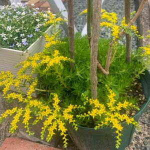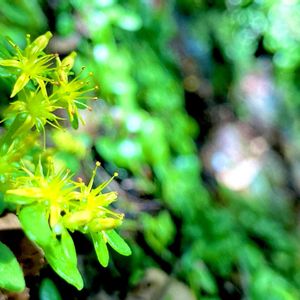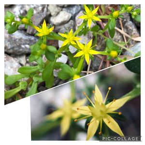 コモチマンネングサ(子持ち万年草)。 ベンケイソウ科マンネングサ属。 どんな花が咲くのか楽しみにしていたところ、今日可愛い花が開花🌼💕 マンネングサの仲間と分かりました。 葉の基部に珠芽(むかご)を付けているので、コモチマンネングサのようです😊