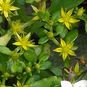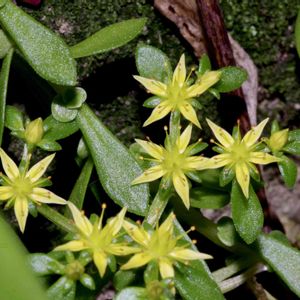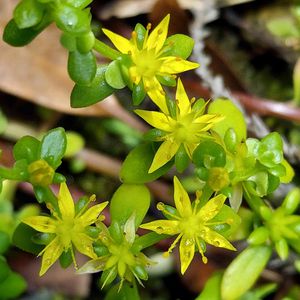 コモチマンネングサ (子持ち万年草) 全体が無毛で多肉質です。茎は根際からよく枝分かれし、下部は地を這い、上部は立ち上がり、茎先の枝に5弁花を平に開きます。 花粉が出来ないので種子は付きませんが、花後にへら形の葉腋に小さな葉を持つ「珠芽(しゅが)」を付けます。これが地面に落ちて子株になって増える事から«子持ち»の名前が付きました。
