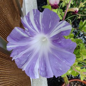 8/21 約1ヶ月前に三渓園の朝顔展で入手した朝顔が、かなり育ちました。 絞り模様の【古今の月】は、花によって模様の入り方が異なります。今日のお花は、ハッキリした模様でした。 団十郎は、花がなかなか付かず、種も付きにくいようです。 お花の色は、赤茶色で渋くて気に入っています🏵️