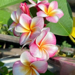 Plumeria "Divine" 今年もディバインが咲き始めました。 2019年の初開花と2021年から毎年咲いてくれています😃 色良し香り良し花付き良しの三拍子そろった優秀な品種だと思います🤍🩷💛 私は娘がハワイで挙式したのを機にこの「ディバイン」と「ミニ ホワイト」、「マルディ グラス」、「ソーントンズ レモン ドロップ」の4種からプルメリア栽培が始まりました💒🏝️