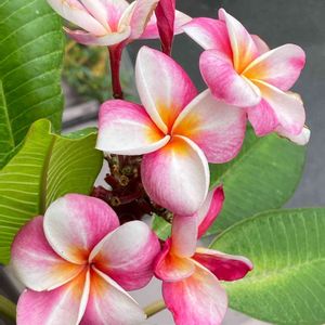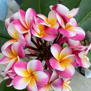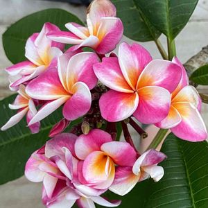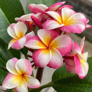 Plumeria 'Divine' & 'Mardi Gras' ディバインとマルディグラスのコラボレーション😄 マルディグラスは更に色が薄くイエローに なってます。 桃の香りは健在ですよ!🤗 いっぺんにブーケ咲きになったらもっと香るでしょうね! ディバインはお花がだいぶ少なくなってきましたが、これから上がってくる蕾も結構あってまだ楽しめそうです。 でもベランダの屋根がある場所に置いているのでハダニにだいぶやられています(>_<) 明日にもシャワー浴びせて殺虫剤を散布します😉