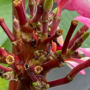Plumeria 'Divine' 花芽はこんな様子です。 咲かずに枯れ落ちる蕾もあり、またこれから上がってくる蕾もあります。