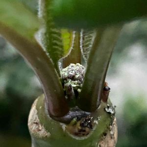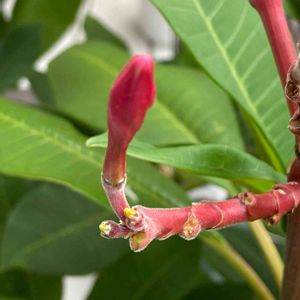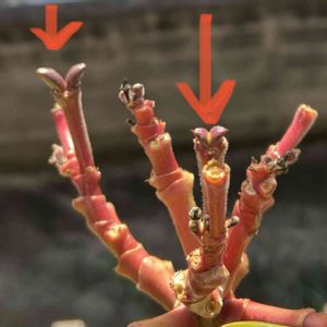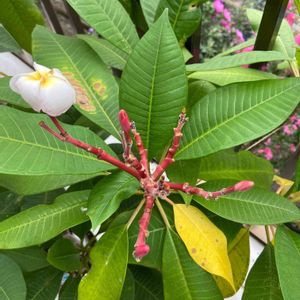 Plumeria 'Mini White' 赤い矢印の所が二股に分かれています。 どうやら種が付くみたいです😃 こんなの初めてです。 上手く育つといいけど😊