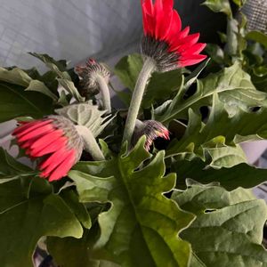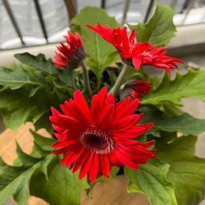 おはようございます😃 真っ赤なガーベラ❤️ 4本の花が咲いてきます❣️ まだ蕾が控えているので楽しみです😊