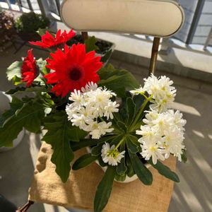 寄せ植え♪ 赤色シクラメンとガーベラ、ビオラ、ストックと、あと何だったかな? もう一鉢は、オンリーホワイトで、ストックとユーフォルビア・ダイヤモンドフロスト、それに確かビオラも。