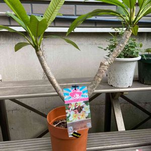 HCからお迎えしたプルメリア、なんと花芽付きで2本の枝に沢山の蕾が!😆 ラベルの写真では白にピンクの縁取りのようです。 これから楽しみです❣️🤗