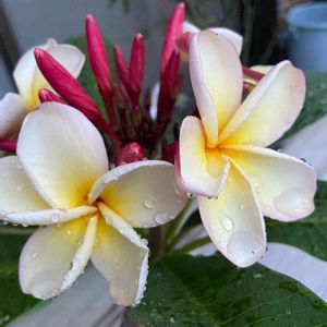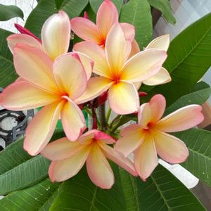 プルメリア「タイ・ジェイド」の花がほぼブーケ咲きになりました😊 近寄るといい香り🎶🥰