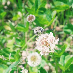 田んぼ近くのシロツメクサ アゴヒゲナガバチ訪問中