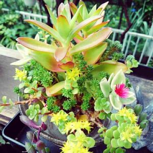 寄せ植えで余ったセダム達をボットごとカゴに入れただけで、良い具合に💕