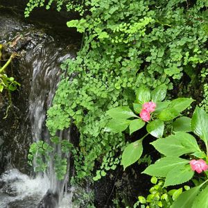 おはようございます🙋♀️ 🏷️水辺の水曜日 🏷️素敵な水曜日 🏷️涼しさをどうぞ 参加させて下さい アジアンタム🌿 ホウライシダ属 花が咲かないが繊細で柔らかくレースの様な重なり合った葉の様子が愛らしいですね😃好きな葉である。側にインパチェンスの花が咲いて素敵な水辺 涼しさやで癒されました😂