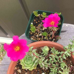 こんにちは😊 毎日アジ〜アッチ過ぎる〜🥵 我が家のバルコニーも直射日光と エアコンの室外機からの熱風で 寄植え気分とは程遠い状況😝 なので、夏らしく 華ミステリア(マジカルキューティー)と セダムピンキー 花がそっくり ポーチュラカとポーチュラカリア❓ 仲間なの❓ 暑くて調べるのも面倒だから きっと親戚だろ〜でヨシ😅