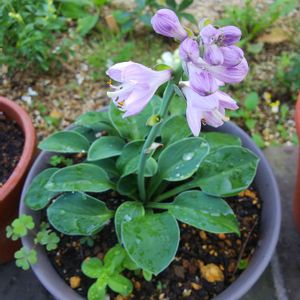 ホスタ ブルーマウスイヤーの花が涼しげに咲いてくれてます😊 冬越しの時に鉢を空けたくて適当に寄せたまま日陰に放置してたのに、こんなにきれいに咲いてくれて✨ホスタ(キボウシ)は本当に優秀です😄
