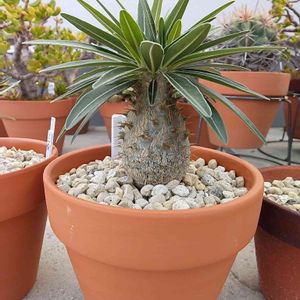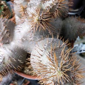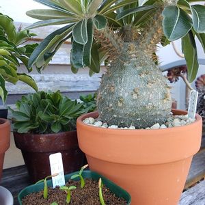 パキポディウムグラキリスたち わかり難いが、とりあえず画像の4株に花芽💠の気配? 今日は気温が下がっている。 開花💠は4月になるかな? 3枚目のミキティー産のグラキリスは もう少し早く3月中?一番最初の開花💠になりそう。