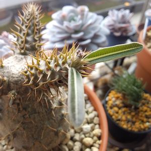 ↙️パキポディウムデカリー 先っちょに新芽🌱良かった~😰 幹の細い所を強剪定するべきか?😔 ⬇ミキティー産デロニクスデカリー こちらは更に目覚めなかったので もうダメかと半分諦めていた😓 小っちゃい新芽🌱🌱 ↘️ミキティー産グラキリス どうやら結実したようです😊 でも種を採るまでは油断しない😤 しかし今年はパキポの授粉空振り続き😥