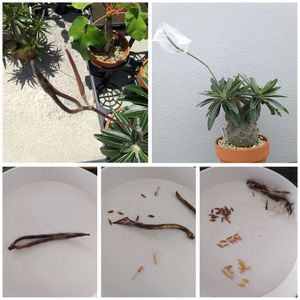 ↖️昨日夕方にミキティー産グラキリスの小さい方の種鞘も裂ける。 こっちは✌ではなく最初から1本。 なので種も少なく15粒。 色の若干悪いのが2粒+3粒を直ぐに水に浸けるが、今朝早速一つ🌱根が出ていた😊 しかし根の色が少し悪いのが気にはなる😅 ⬅デイッキア種鞘 いつの間にか茶色い破片みたいなのが飛び散っていたのだが、これが種?らしい?😓 デイッキアの種を採った事が無いのでよくわからない。 こんなペラペラなので良いのかな… ↙️阿房宮 今年は夏になってもそこそこ☀太陽に当たる場所に。 完全放置で勝手に💠結実しているようだ。 このように種が自然にできるのは嬉しい反面、種まきのスペース問題が悩ましい😔 ペラルゴニウム、阿房宮、ウンカリーナ、シゾバシスイントゥリカータ、マッソニア、断崖の女王 これらが種まき保留中😔 ➡👾火星人🌱 一つの種から双子👾👾は2度目😊