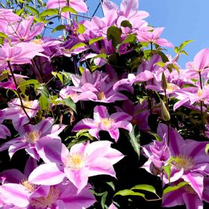 今日のお花『クレマチス』 今年の6月3日、岩手のクレマチス専門店イーサゴのガーデン。 花巻の薔薇祭りを楽しんだ後、足を伸ばした時のpic 真っ青な空に向かって、 クレマチスがモクモクと絡みついて咲いていた🌸 ジャックと豆の木みたいだった〜🎶🎶🎶