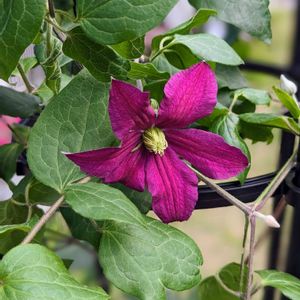 ✨クレマチス ビクター・ヒューゴ 1輪目ひらく はじめてトレリスに誘引してみました Victor Hugo フランスの詩人、小説家のビクトル・ユゴーと同じ名前 ビエネッタと同じく イギリスのクレマチス育苗家と デンマークのバラナーサリー RJ Evison & Poulsen Roser作出 2002年のことだそうです 日韓W杯の年に作出されたクレマチス 20年の時を経て、去年から我が家に🥹
