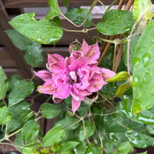 🌿✨Morning🌱 クレマチス マリア・コルネリア 丸みのある やわらかな ふわふわ☺️👍 枝の伸びがよく、120cm支柱を三角に立てて足りない様子 この花はかなりかわいい😆 上品さがある