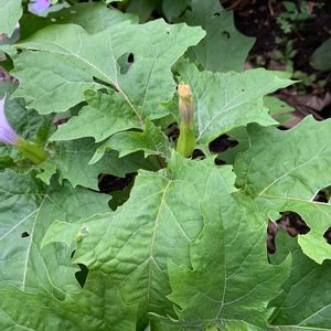 ヨウシュチョウセンアサガオ (洋種朝鮮朝顔) ナス科チョウセンアサガオ属の一年草 家が解体され、更地になった所に生えていました。 有毒物質アルカロイドを含み、 葉の汁が目に入ると、目が見えなくなり、 食べると、激しい中毒症状を起こすそうですが、 麻酔薬の原料として重要だそうです( ´-`)