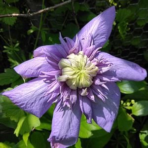 クレマチス ブルーライト 巨大で形が今一つな1輪めのあとは中輪くらいで咲いてくれています。 中心の万重部分が小さめで残念です。数年前に一番最初にお迎えしたブルーライトは最初から3枚目のような幅広で大きめな万重で咲いていてそれが好みでした。万重はかなり色々な感じで咲くようで針のように細いのもあります。写真2枚目と3枚目はネットからお借りしました。