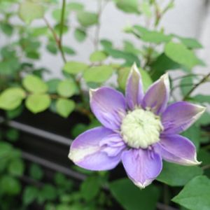 クレマチス ブルーライトが開花 咲き始めは色が出てないですけど、開ききる頃には爽やかな色になります 花芯は緑ですね