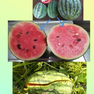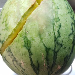 ⬆️以前収穫した🍉の内、最後に残った一番小さな楕円形の🍉(真ん中) これもダメ元で切ってみました。 ➡️見た目は案外美味しそう💕 これは期待できるかも🎶 ⬇️それとは別に、今朝畑に長さ20cmぐらいの楕円形の🍉が突如出現しました。 ツルは付いて無くて、頭の部分はえぐり取られたように穴が空いていて、斜めにひび割れていました。 一ヶ月位前?に我が家の畑から盗まれた2個の内の1個だと思います😓 犯人から返品された?😱昨日の夕方までは多分無かったので、深夜から未明にかけて置いて行ったのでしょうか?? 見知らぬ誰かが敷地内に2度も立ち入ったというのも、🍉を置いて行ったというのも、どちらも気持ち悪いです😨