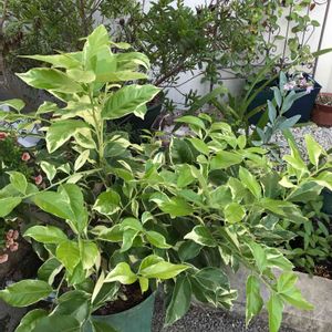 実がならないレモン・ピンクレモネード🍋 斑入り葉が爽やかなので、実らなくてもまあいいでしょう マイヤーレモン(普通のレモン)は毎年実るので、これも来年あたりは収穫出来るといいな